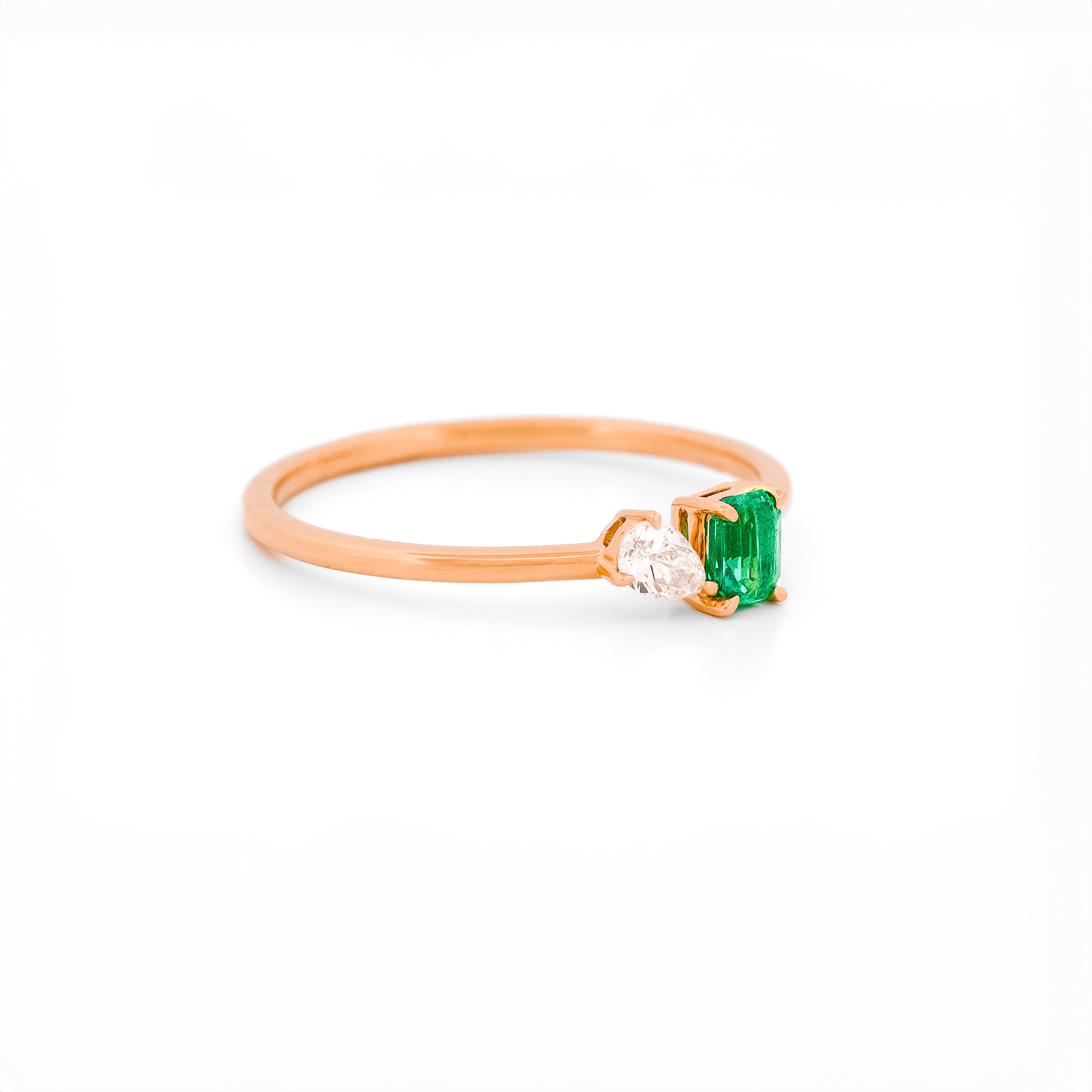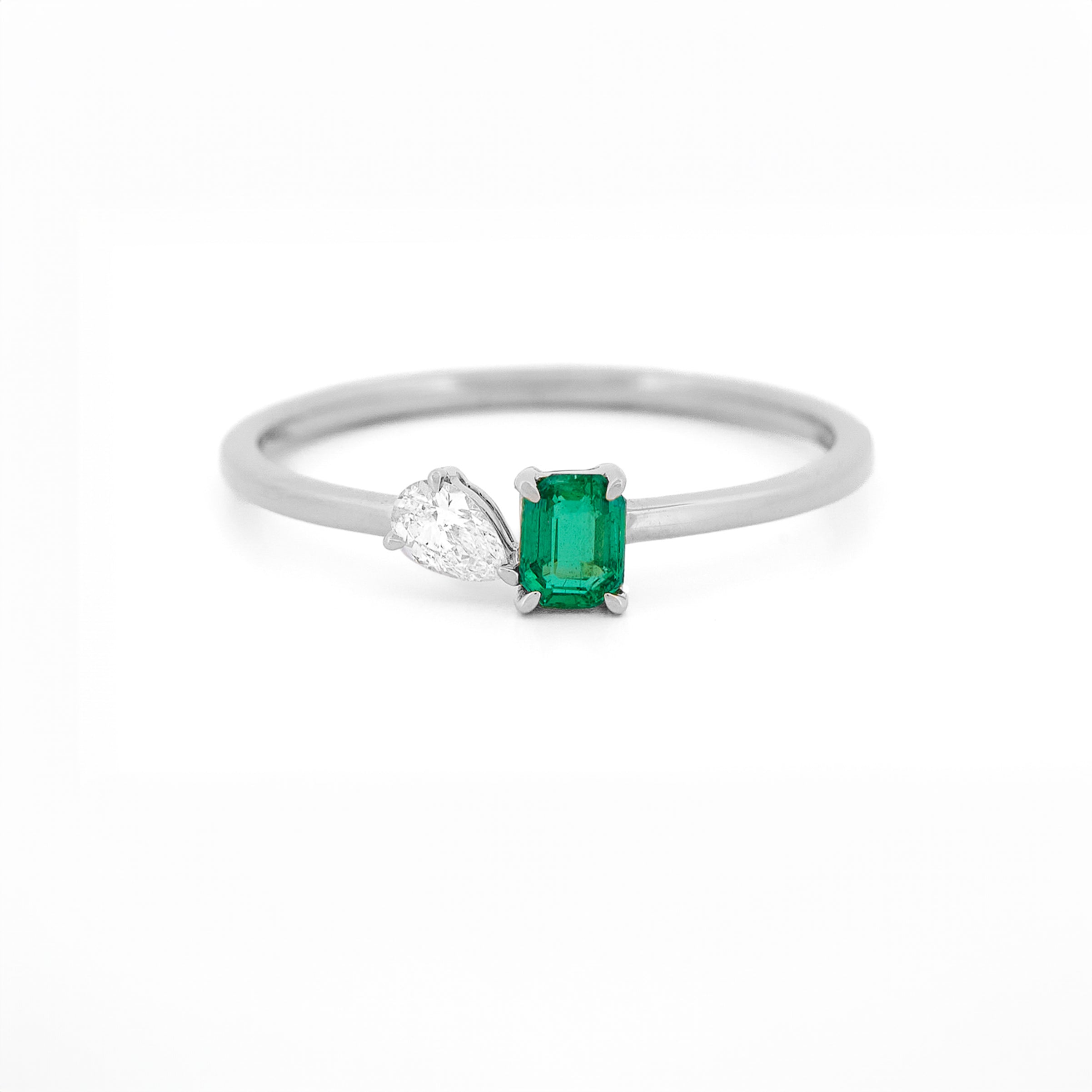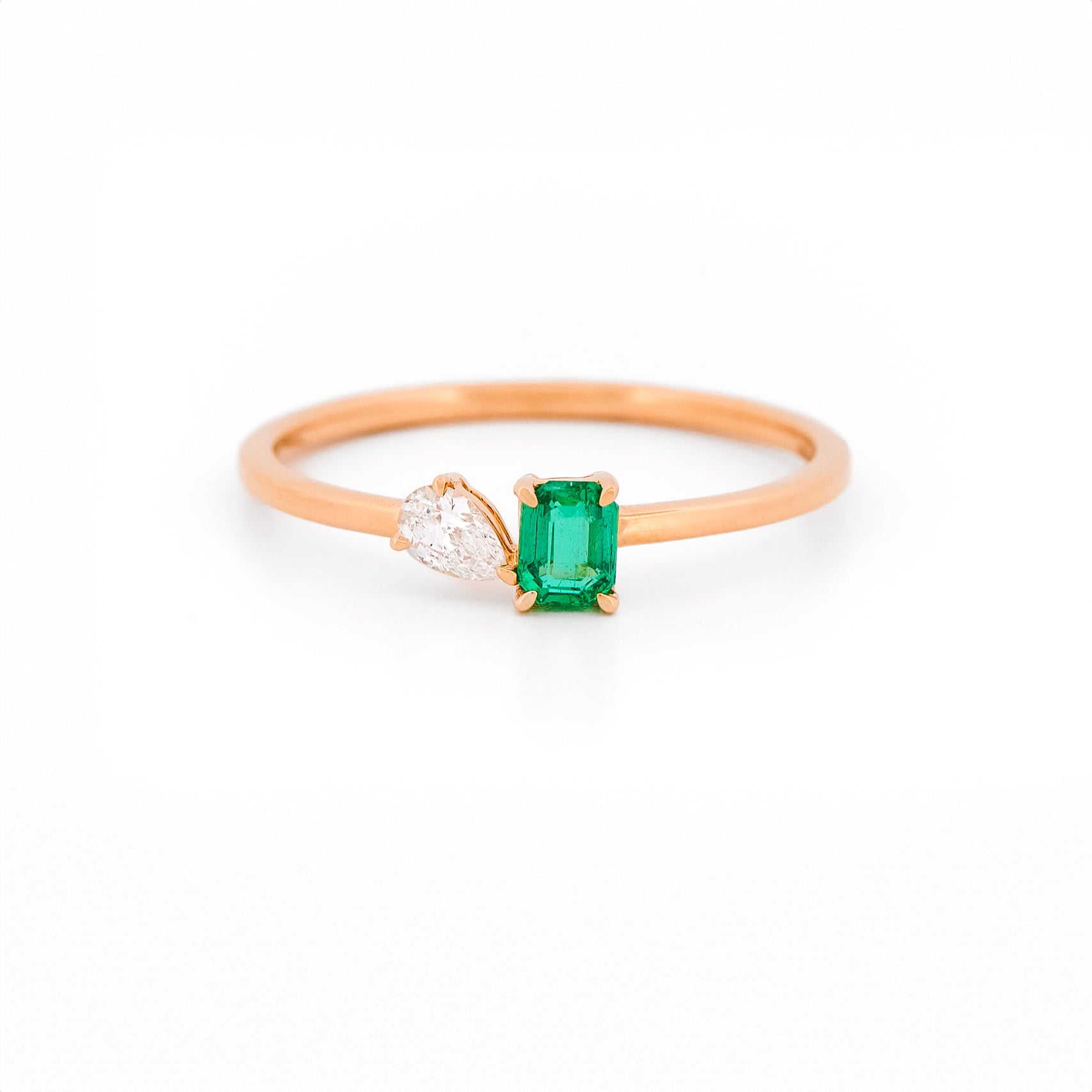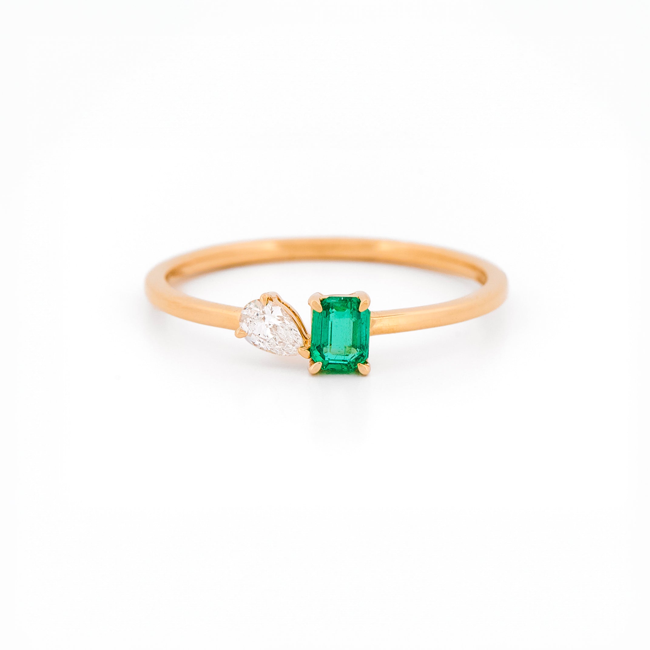 Inspired by the idea of "You and Me," this delightful ring adds a playful and stylish vibe to any outfit, serving as a lovely token of affection. It showcases a sparkling teardrop diamond alongside a vibrant emerald, both set in luxurious 18k gold, blending subtle elegance with eye-catching sparkle. Wear it alone to make a bold statement or stack it with other rings to express your personal style. Dreaming of a different gemstone mix or your birthstones? We’re here to create a custom design just for you. Embrace fun and sophistication with this charming ring.