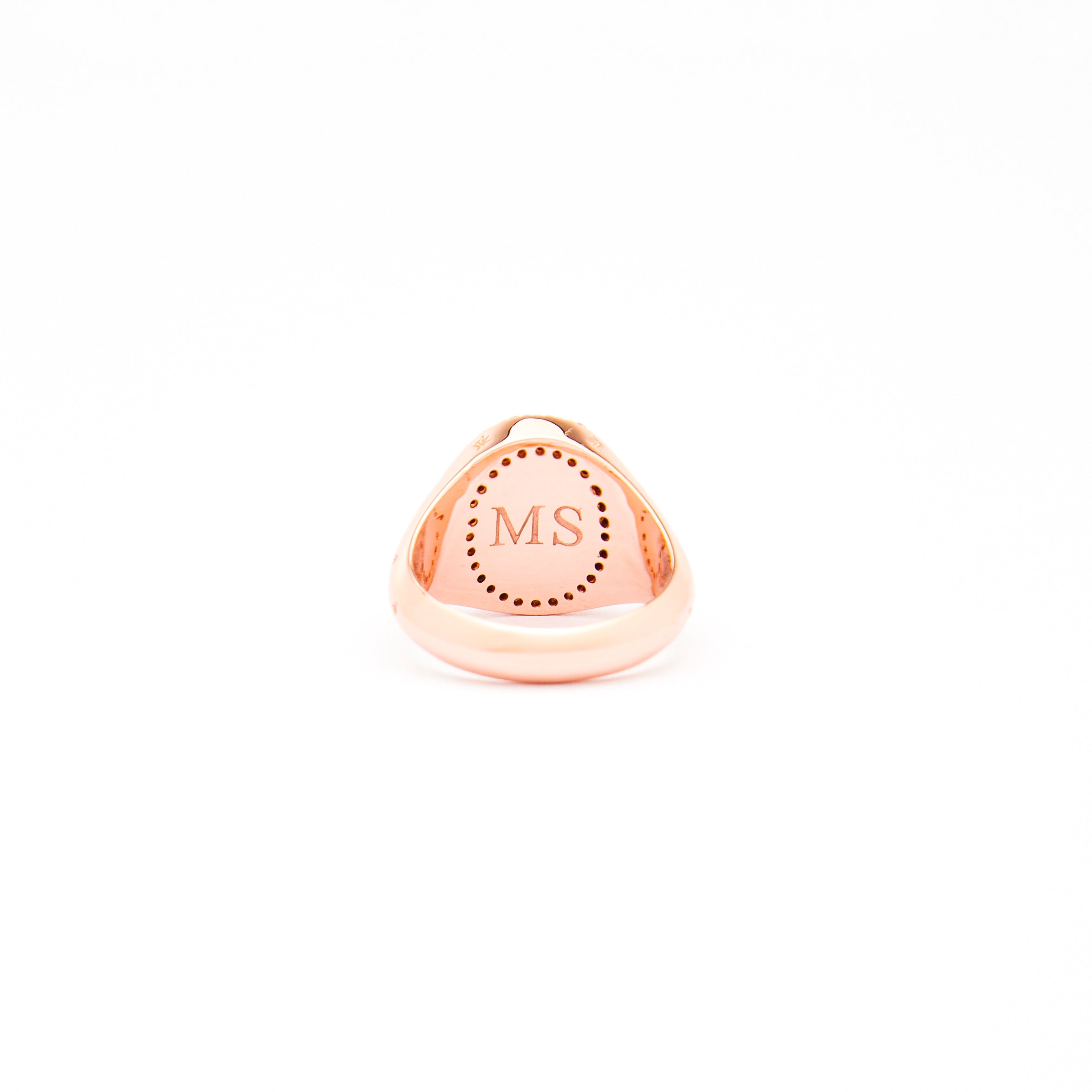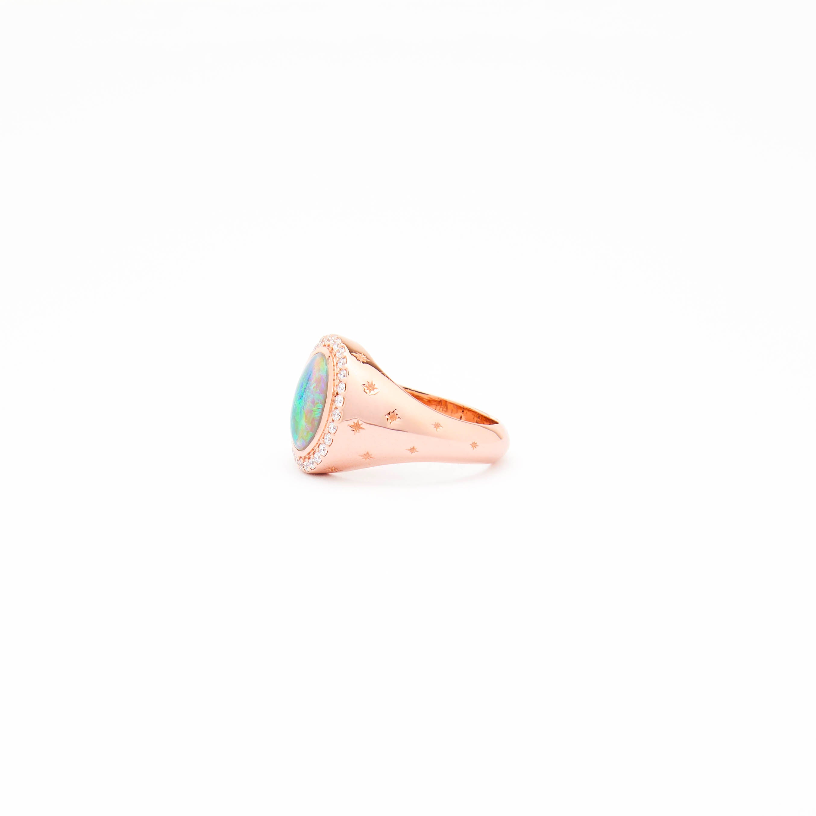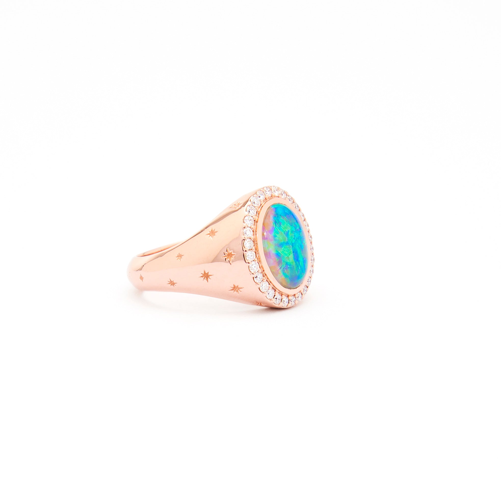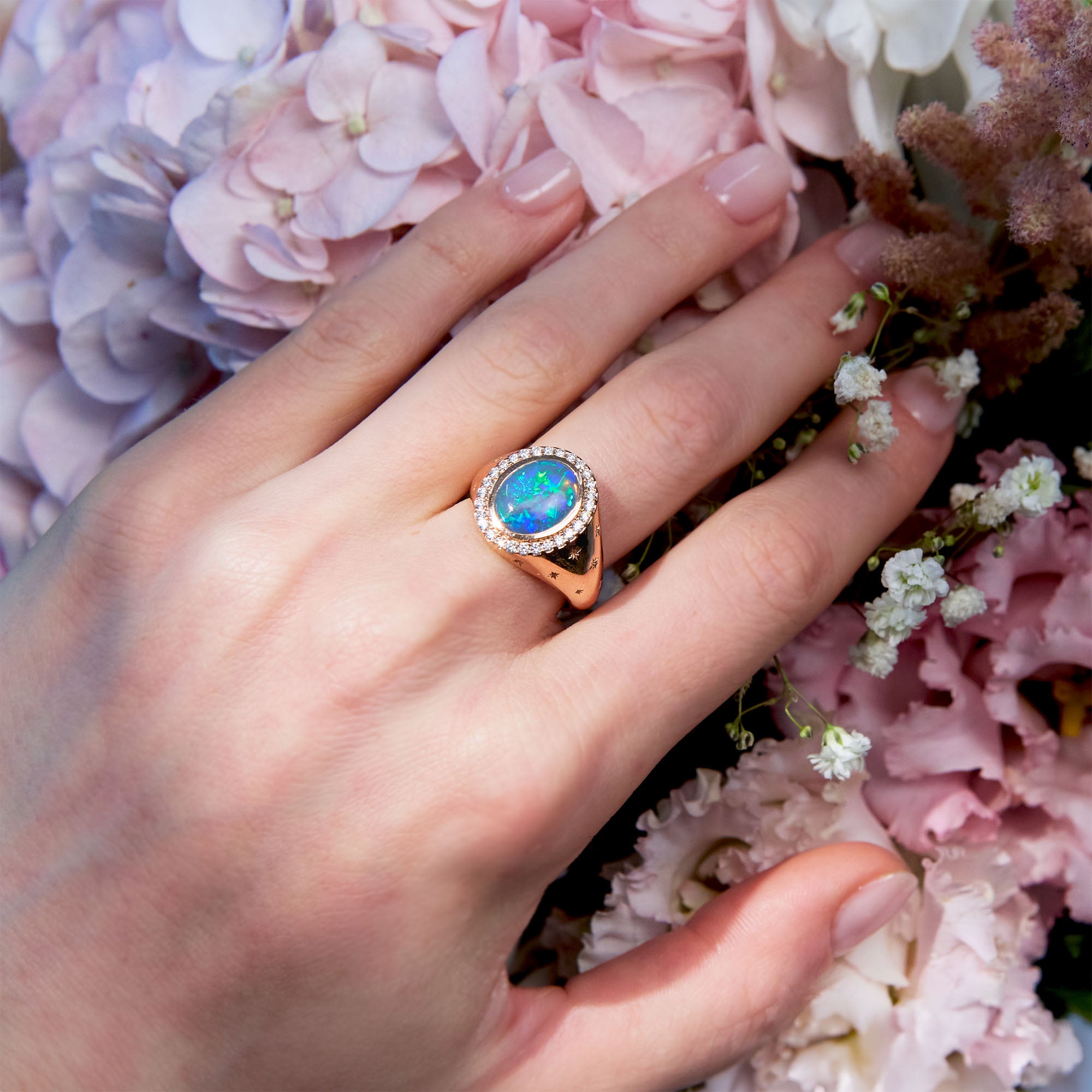 This captivating ring is truly a work of art. We selected an Australian Opal as the centrepiece for its ability to evoke the enchantment and mystery of the vast universe, reminiscent of the Aurora Borealis or unseen galaxies. The opal is accentuated with surrounding white diamonds and intricately carved stars for a celestial touch. Personalise the back with a lucky number or the initials of loved ones to keep them close to heart. Reach out to us to select your centrepiece gem and collaborate on creating a truly breathtaking piece. When considering to order, it's important to note the versatility of Australian Opals, which can be found in a wide range of hues and shades. Discover more about the symbolism of Australian Opals to understand why we feature this extraordinary gem in many of our designs.