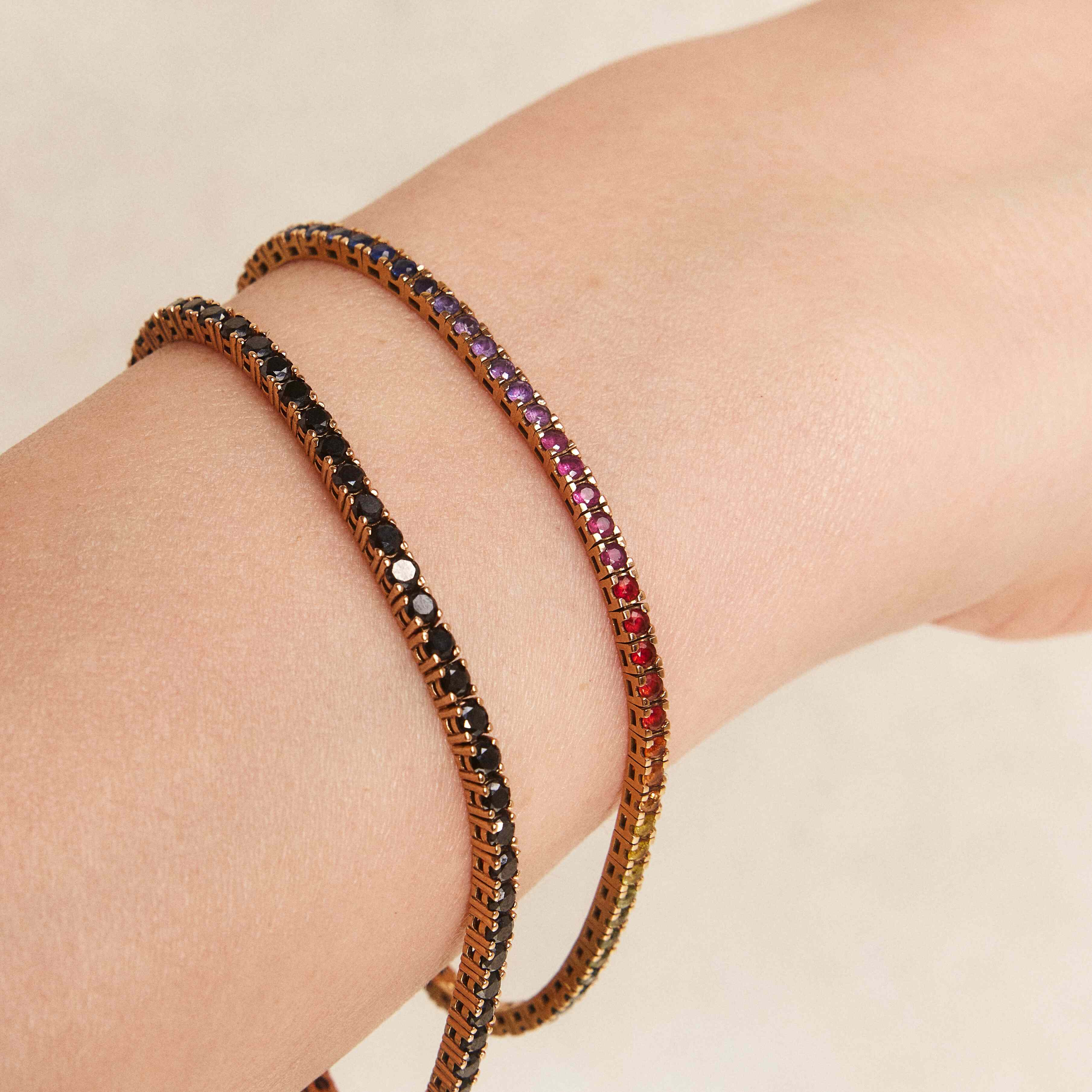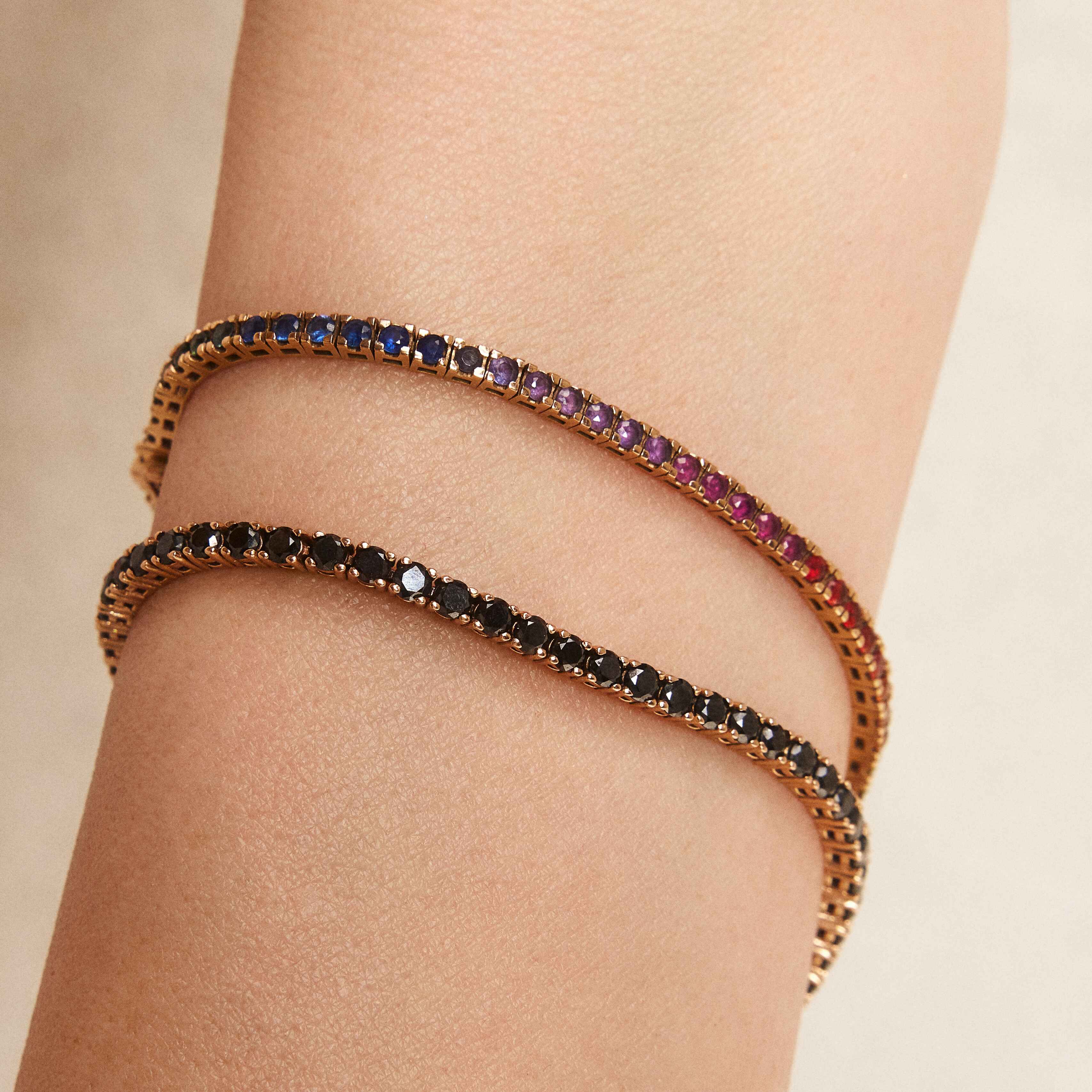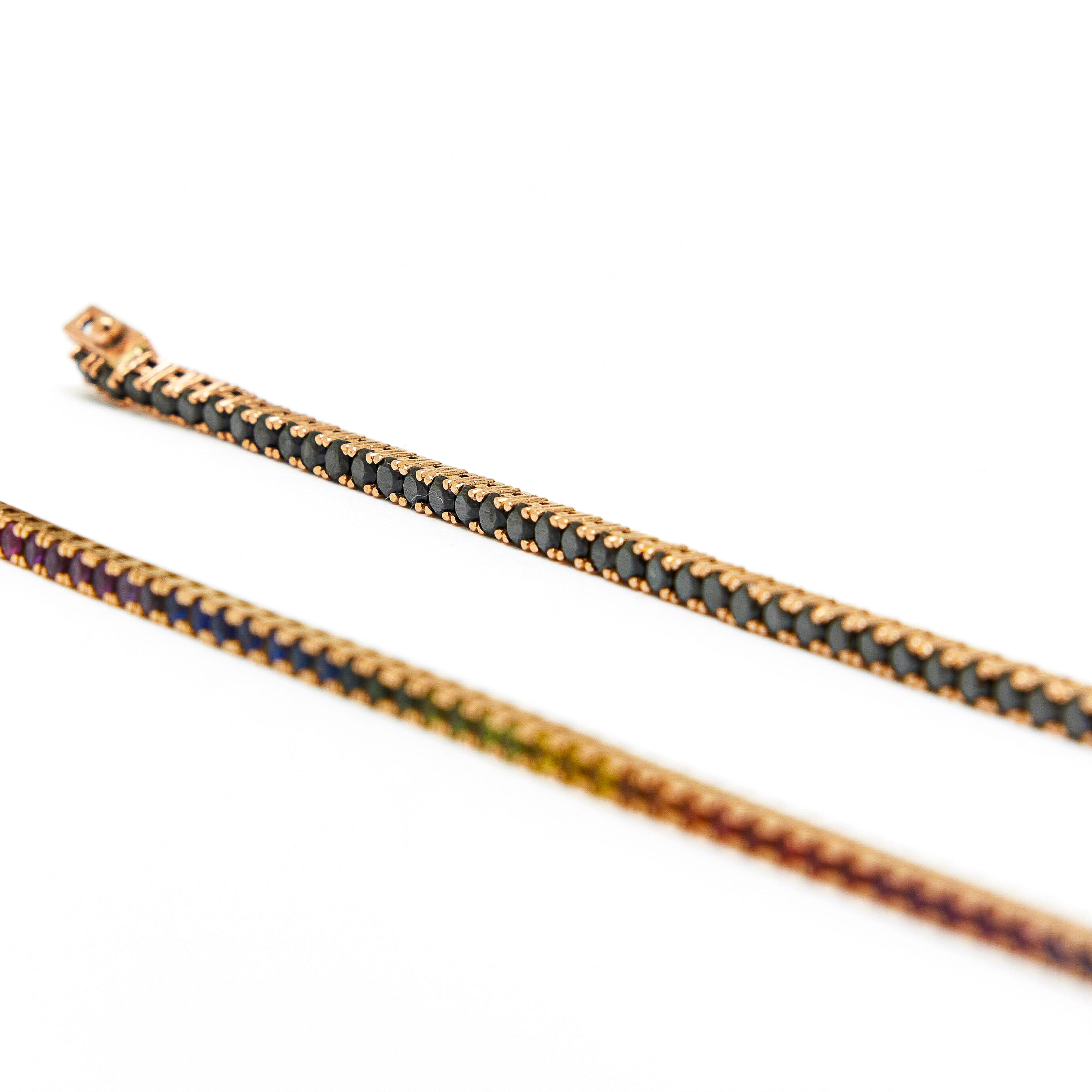 Indulge in the timeless elegance of our exquisite Diamond Tennis Bracelet, meticulously crafted in your choice of 18k or 14k white, yellow, or rose gold. You can acquire the piece in the pictures that is made with 2 mm black round diamonds, weighing approximately 3 cts or for a personalised touch, we offer a range of colours, and ct weight upon request, allowing you to create a one-of-a-kind piece that reflects your unique style. Feel free to reach out to us and begin the journey of crafting a bespoke treasure exclusively for you. Pair it effortlessly with our Mixed Shapes Diamond Tennis Necklace or the enchanting Fabulous Eternity Diamond Ring for a harmonious ensemble that radiates luxury and refinement.